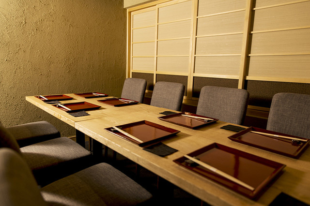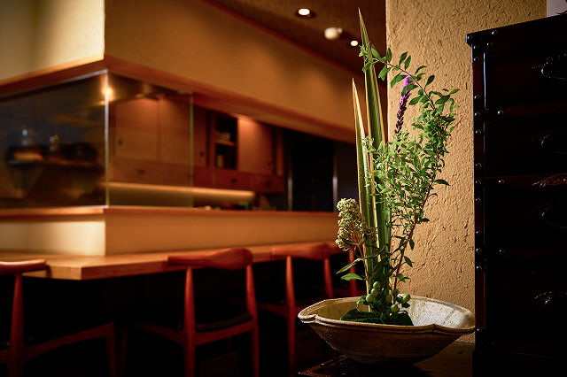 落ち着いた雰囲気の店内にはカウンター席とテーブル席が用意され、店主の調理する様子を臨場感を持って愉しめるカウンター席は、個人利用のみならず少数人での会食にも対応。テーブル席は個室利用も可能で、接待やプライベートな会食にも安心して利用できる。 使用する器も料理をより際立たせる名品を厳選して使用しているため、もてなしの席にも最適。